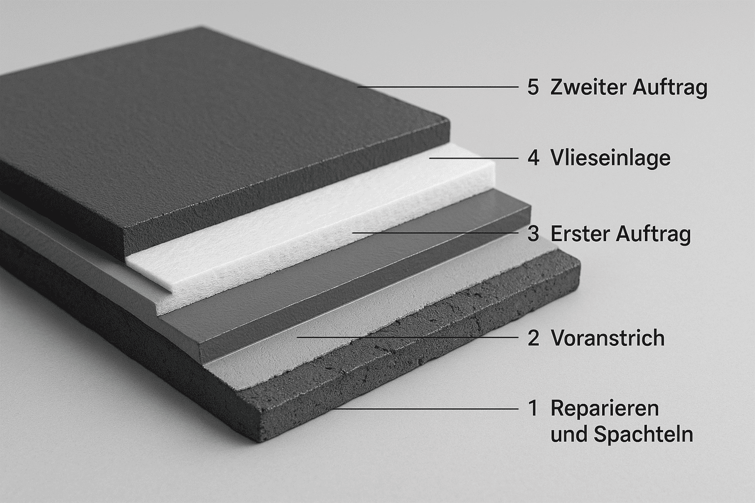 Der mehrschichtige Aufbau sorgt für maximalen Schutz, Haftung und Elastizität. Die Kombination aus Grundierung, Spachtelmasse, Verstärkungseinlage und mehreren Anstrichen garantiert eine langlebige Abdichtung.